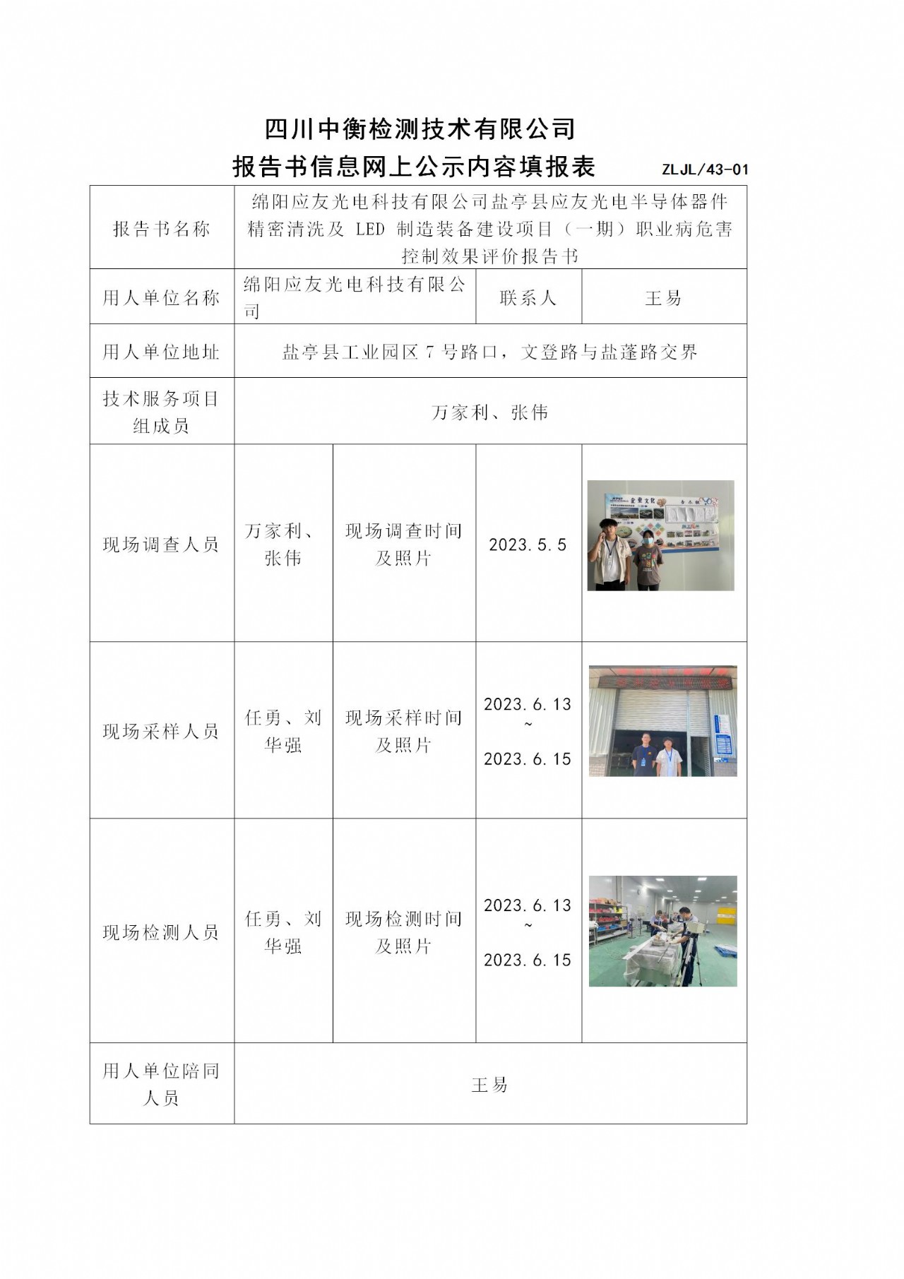 绵阳应友光电科技有限公司盐亭县应友光电半导体器件精密清洗及 LED 制造装备建设项目(一期)职业病危害控制效果评价
