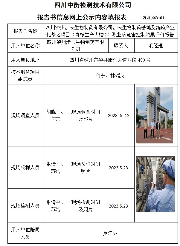 四川泸州步长生物制药有限公司步长生物制药基地及新药产业化基地项目(真核生产大楼2)职业病危害控制效果评价报告