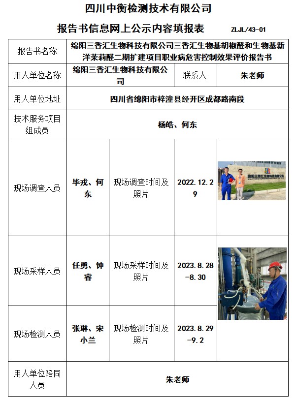 绵阳三香汇生物科技有限公司三香汇生物基胡椒醛和生物基新洋茉莉醛二期扩建项目职业病危害控制效果评价报告书