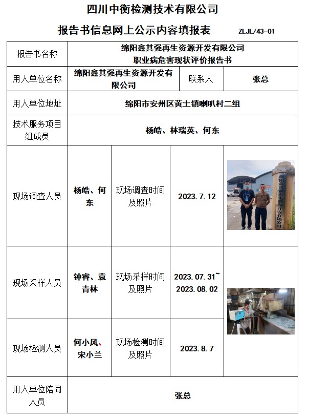 绵阳鑫其强再生资源开发有限公司 职业病危害现状评价报告书
