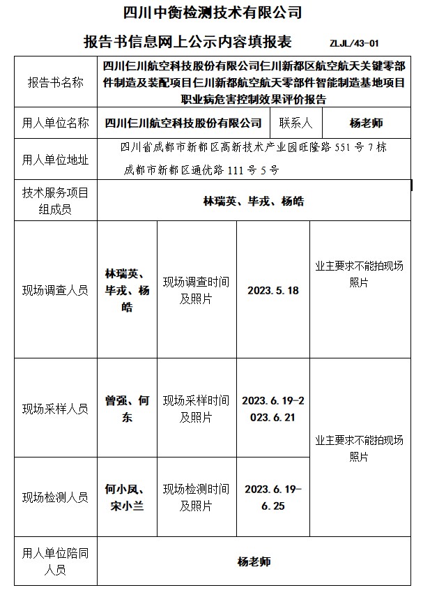 四川仨川航空科技股份有限公司仨川新都区航空航天关键零部件制造及装配项目仨川新都航空航天零部件智能制造基地项目职业病危害控制效果评价报告