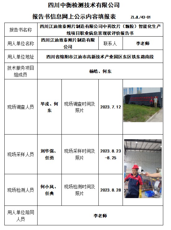 四川江油致泰附片制造有限公司中药饮片(颗粒)智能化生产线项目职业病危害现状评价报告书