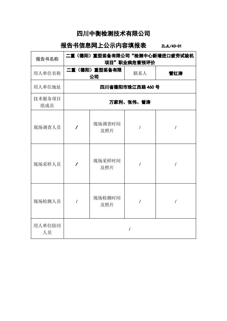 二重(德阳)重型装备有限公司“检测中心新增进口疲劳试验机项目”职业病危害预评价