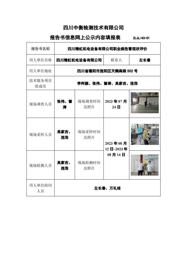 四川精虹机电设备有限公司职业病危害现状评价