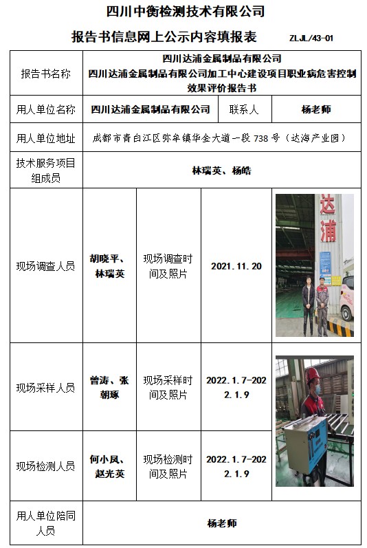 四川达浦金属制品有限公司 四川达浦金属制品有限公司加工中心建设项目职业病危害控制效果评价报告书