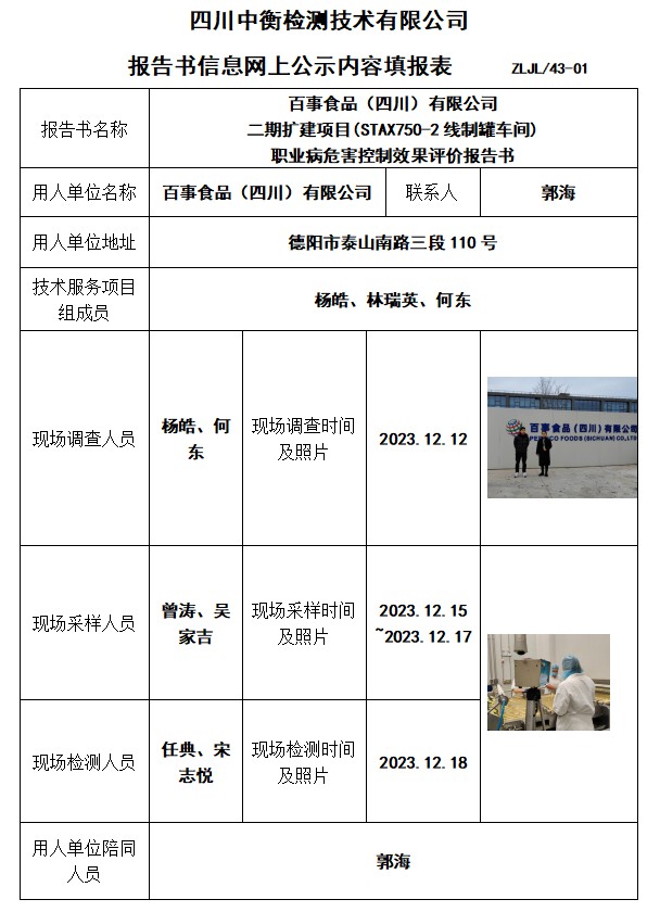 百事食品(四川)有限公司 二期扩建项目(STAX750-2线制罐车间) 职业病危害控制效果评价报告书
