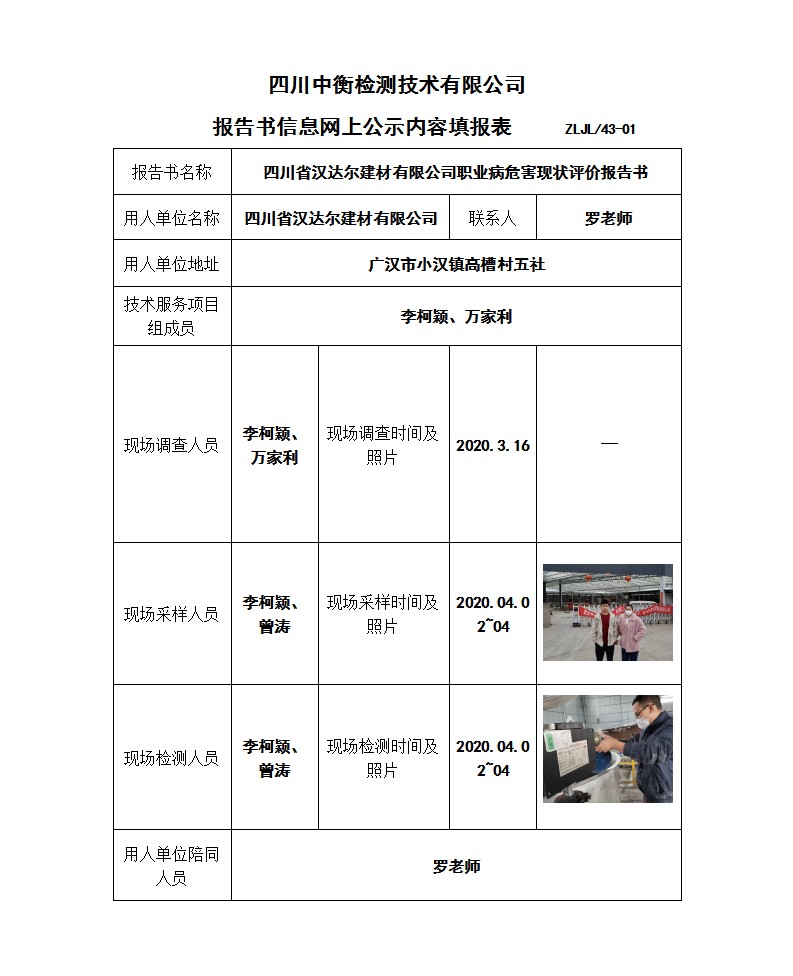 四川省汉达尔建材有限公司 职业病危害现状评价报告书
