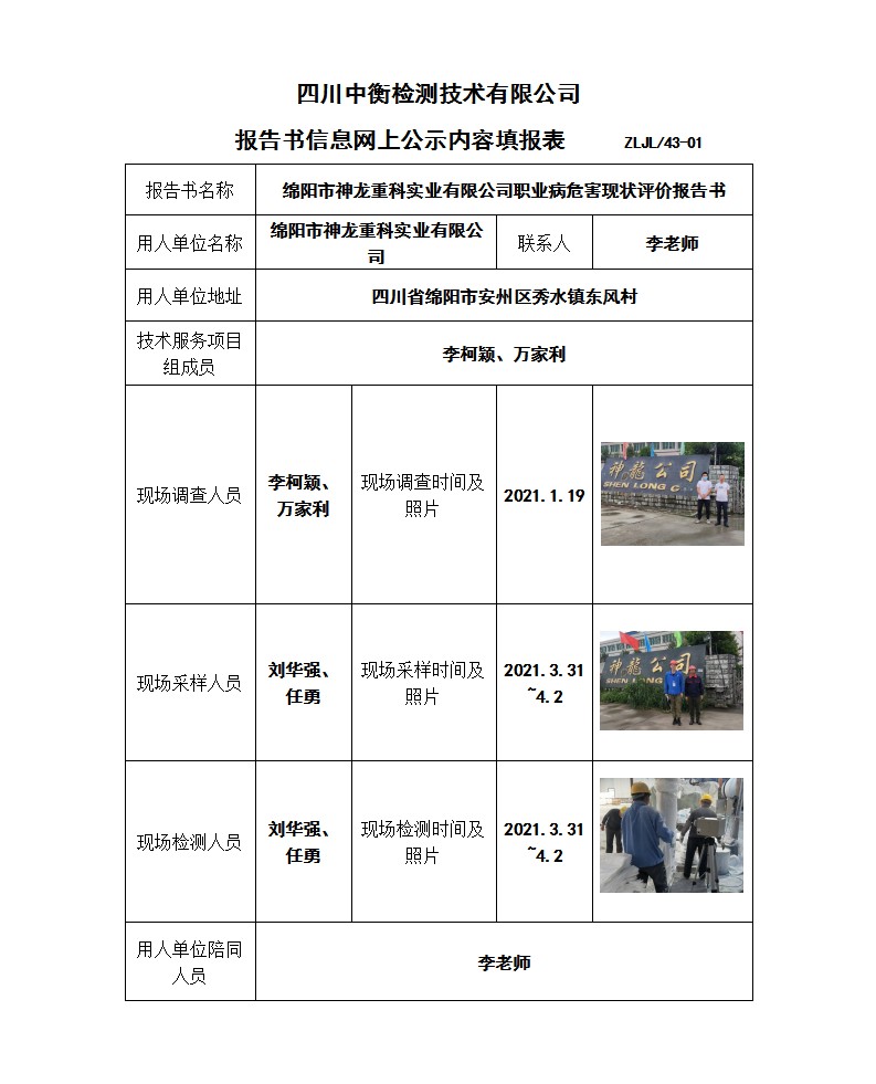 绵阳市神龙重科实业有限公司职业病危害现状评价