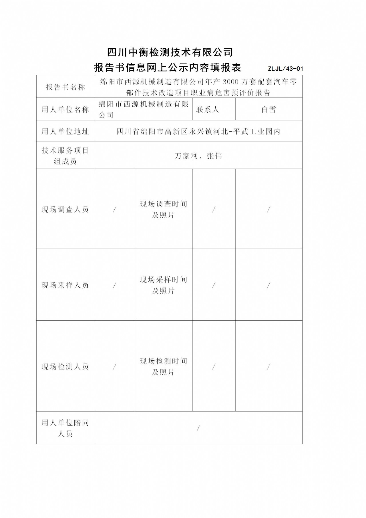 绵阳市西源机械制造有限公司年产3000万套配套汽车零部件技术改造项目职业病危害预评价