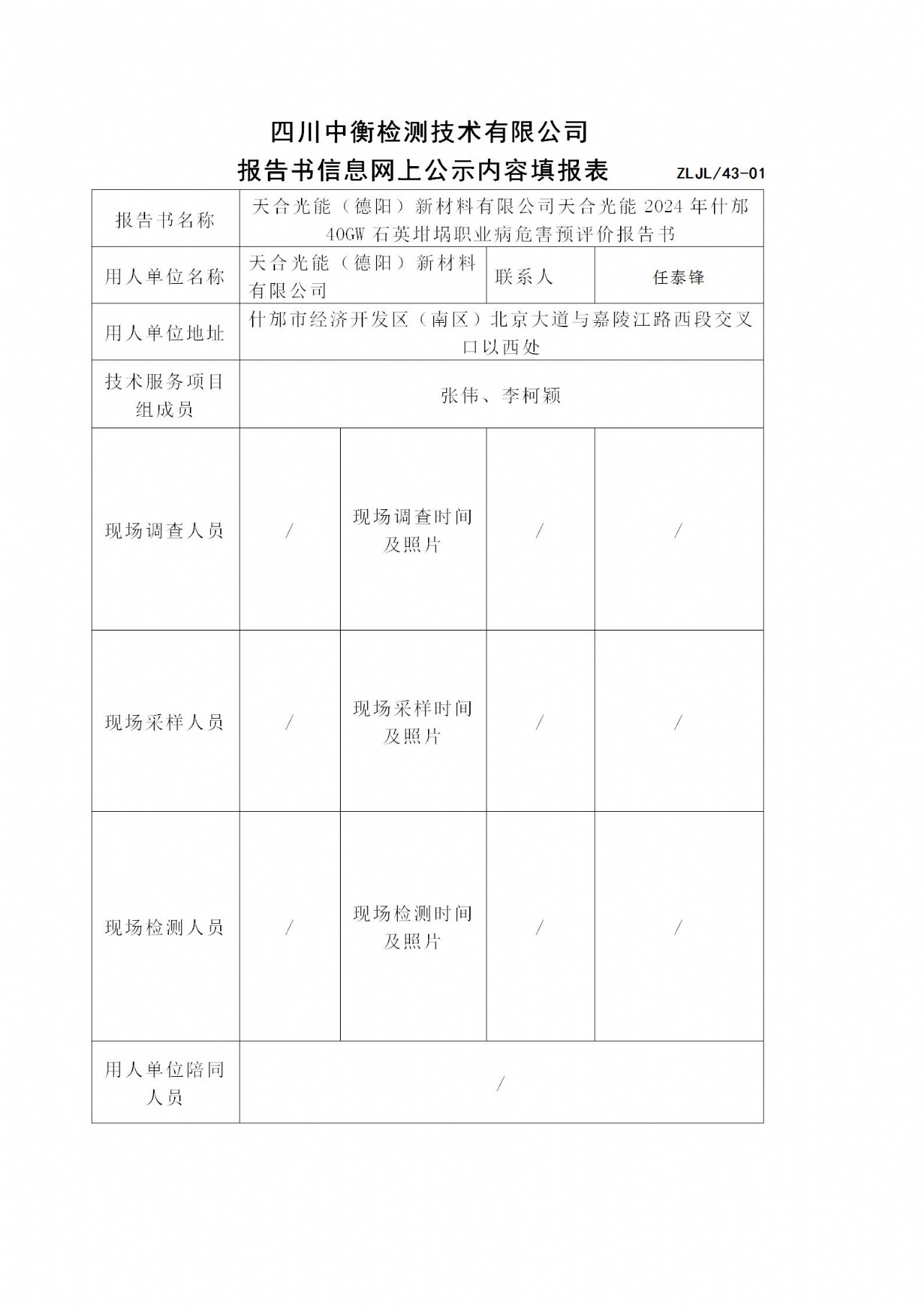 天合光能(德阳)新材料有限公司天合光能2024年什邡40GW石英坩埚职业病危害预评价