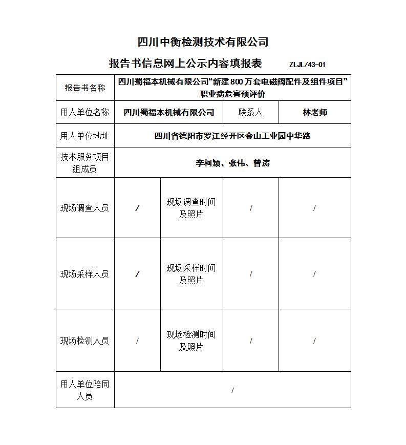 四川蜀福本机械有限公司“新建800万套电磁阀配件及组件项目”职业病危害预评价