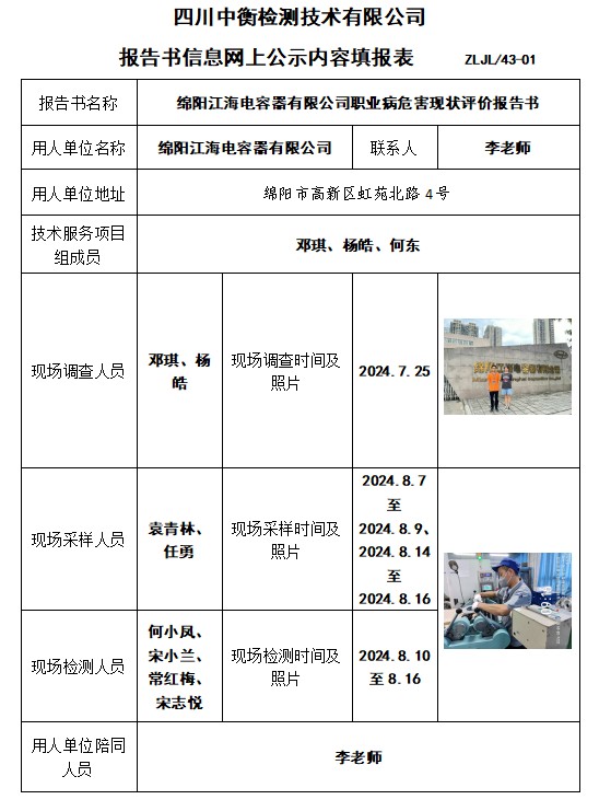 绵阳江海电容器有限公司职业病危害现状评价报告