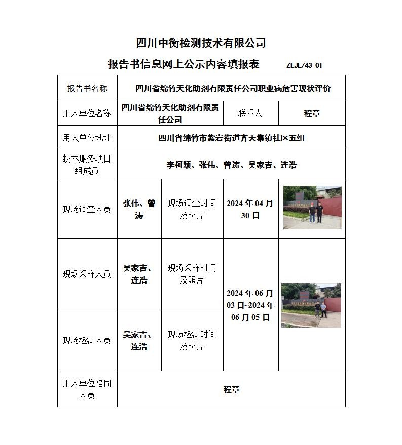 四川省绵竹天化助剂有限责任公司职业病危害现状评价