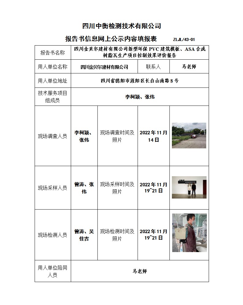 四川金贝尔建材有限公司 新型环保PVC建筑模板、ASA合成树脂瓦生产项目 职业病危害控制效果评价报告书