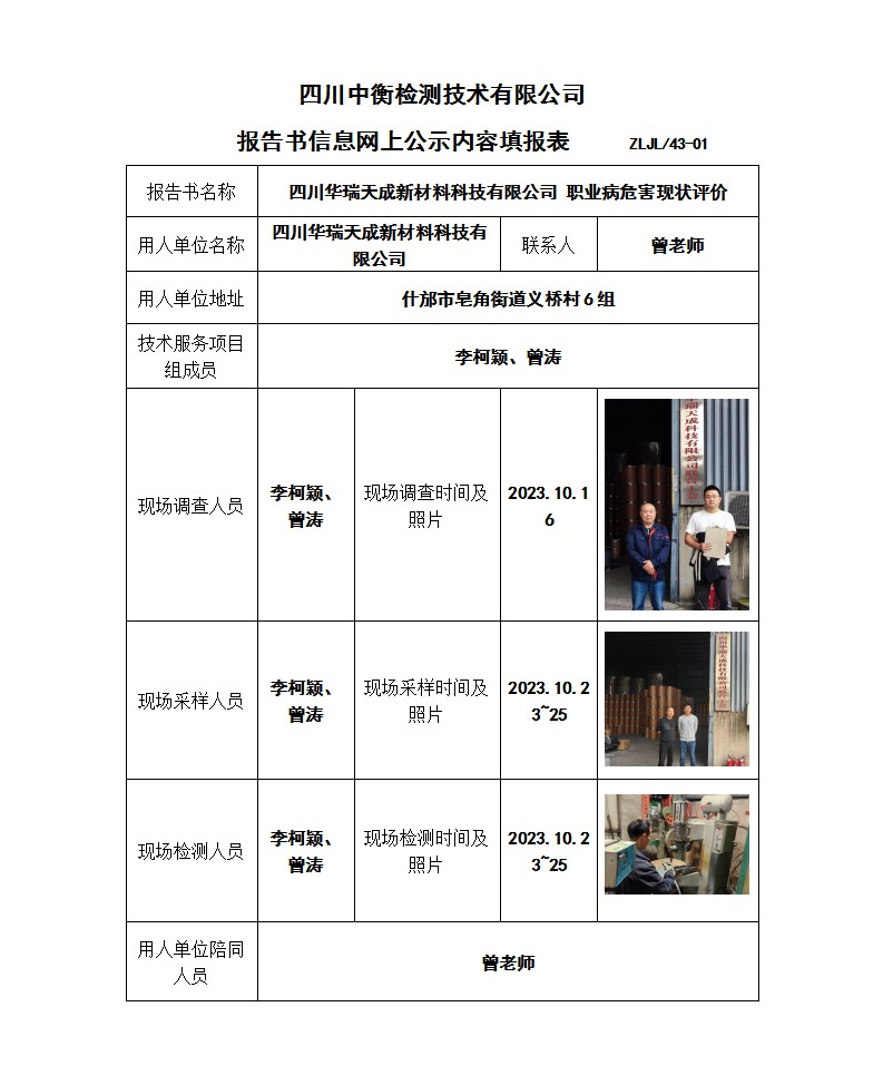 四川华瑞天成新材料科技有限公司 职业病危害现状评价报告书